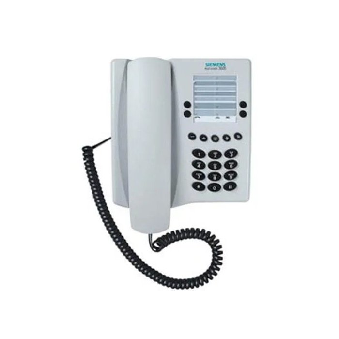 Telefone SIEMENS 3005 14 memórias 3 volumes e 3 melodias de campainha Possui modelo opcional com chave de bloqueio. Descrição: O euroset 3005 possui design moderno e memória para até 14 numeros, o que torna mais rápido e fácil o seu contato com as pessoas. Foi desenvolvido para ser utilizado tanto em casa como no escritório. Funções: Discagem Tom / Pulso sim Rediscagem do ultimo numero sim Ajuste do Volume 3 níveis Ajuste da Tonalidade 3 melodias Memória sim, 4 de toque unico e 10 de dois toques Tecla Mute sim Pausa sim Tecla Flash sim, Programável (100 e 250 ms) Cores ártico e Grafite Garantia 3 anos