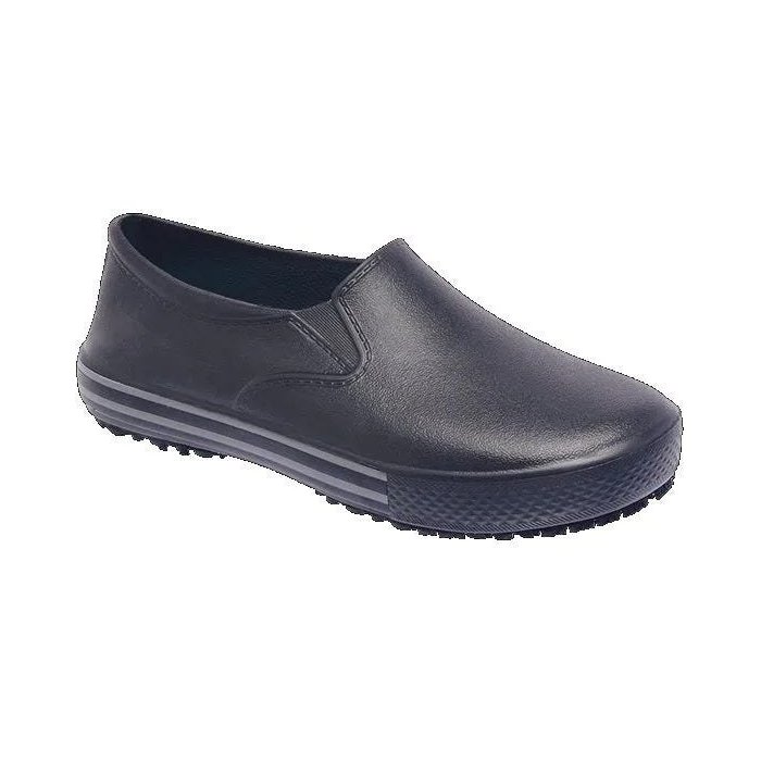 Calçado ocupacional de uso profissional tipo tênis, fechado na parte do calcanhar e na parte superior, confeccionado em EVA solado de borracha antiderrapante, resistente ao escorregamento em piso cerâmico com solução de detergente e piso de aço com solução de glicerol, resistente ao óleo combustível e à absorção de energia na região do salto.