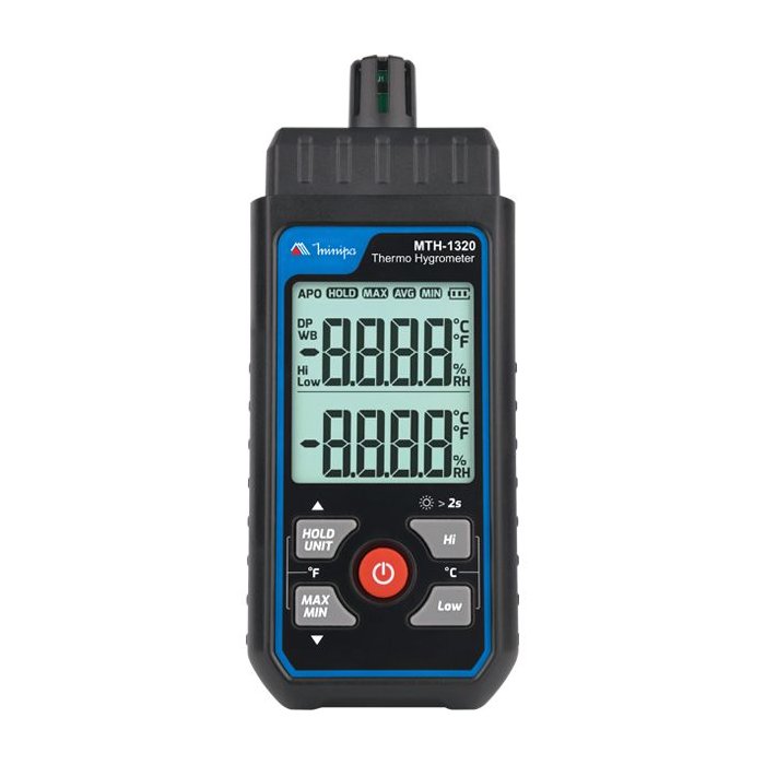 O MTH-1320 um termo-higrômetro de alta precisão, oferece facilidade de uso e diversas funcionalidades essenciais para medição de temperatura e umidade. Inclui funções como data hold, medição máxima/mínima/média, desligamento automático com opção de cancelamento, configuração de limites de alarme Hi-Low, luz de fundo e alarme de luz colorida para leitura em ambientes com pouca iluminação, e indicação de bateria baixa para garantir confiabilidade nas medições.