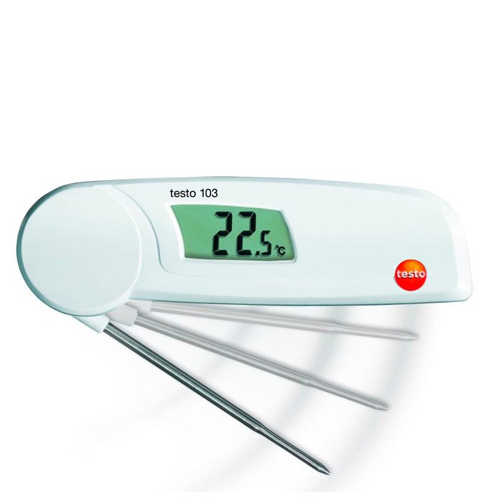 Termômetro Imersão/Penetração com Sonda Dobrável 30 a 220°C Testo 103. O testo 103 mede temperaturas dos alimentos a qualquer momento - na produção, armazenamento e processo, na gastronomia, cadeias de supermercado, retalhista e grossista alimentar, ou em áreas industriais.