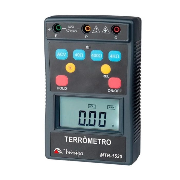 Instrumento digital que tem como aplicação testes e medições de sistemas de aterramento de acordo com a categoria de segurança CAT IV 400V. Produto controlado por microprocessador que possui três faixas de medida com precisão básica de 2%. Possui resolução de 0,01 ohms na escala de 40 ohms e funções adicionais como Auto Desligamento, congelamento de leitura, iluminação do display, modo relativo e indicação de bateria fraca. A medida de resistência é realizada por um inversor de corrente com 820Hz e corrente aproximada de 2mA de forma a minimizar interferências.