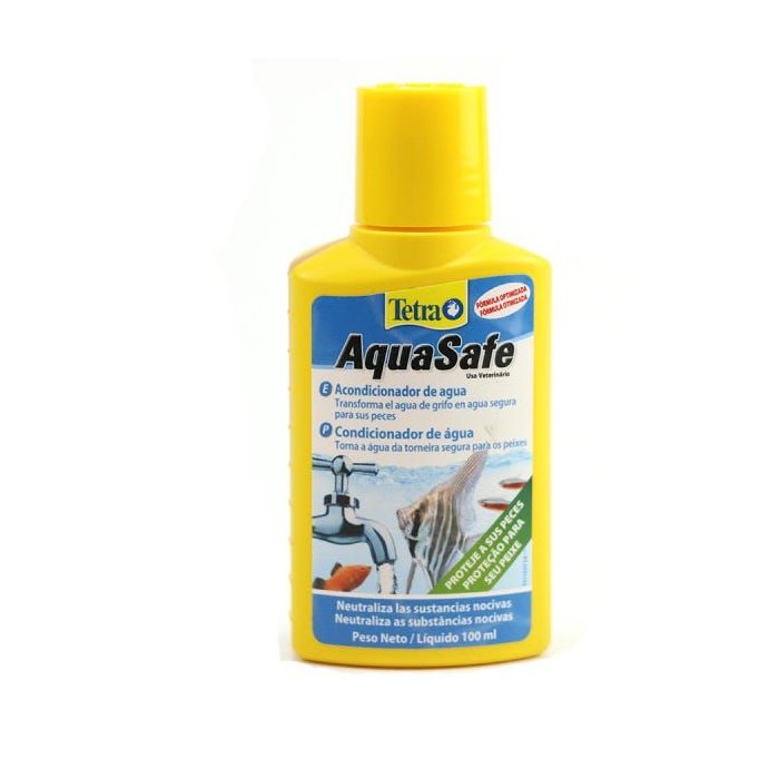 Tetra AquaSafe é um condicionador de água que imediatamente transforma a água da torneira agressiva em água do aquário quase natural propício para o peixe.