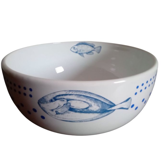 Tigela grande branca com detalhes em peixes azuis. Opção perfeita para servir saladas, massas e molhos. Fabricada em cerâmica de alta qualidade.