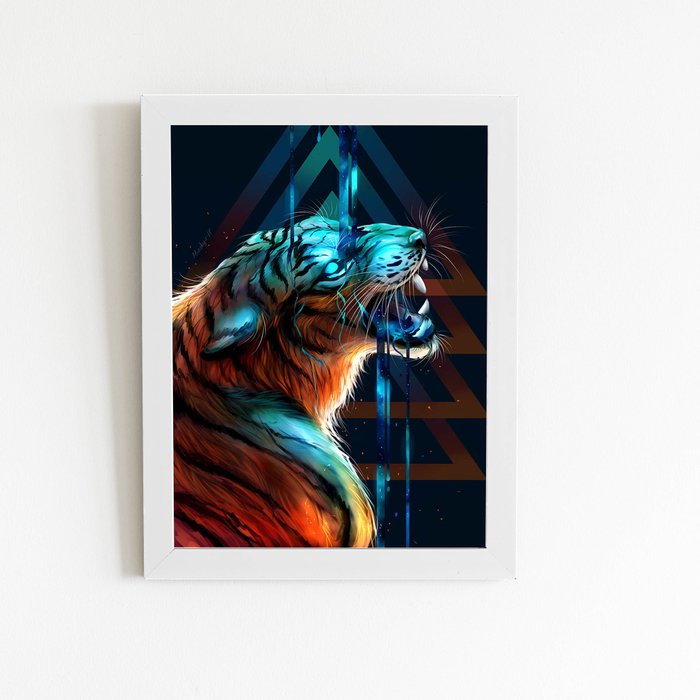 Tigre Azul Desenho Animais Quadro Moldura Branca 60x40cm