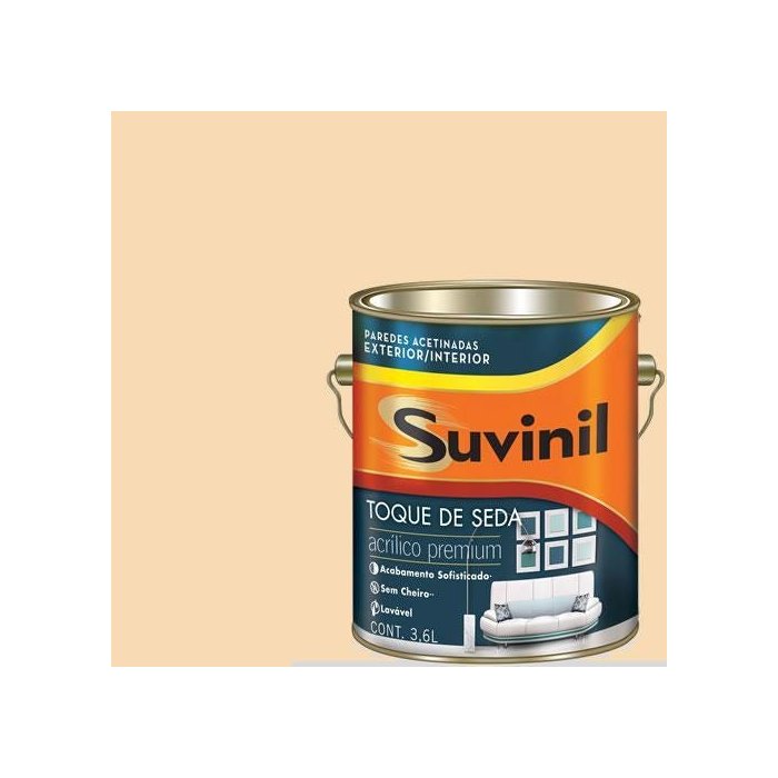 Descrição: Tinta acrílica Toque de Seda Suvinil. Tinta acrílica na cor branca com acabamento acetinado. Indicada tanto para uso interno ou externo tem alta durabilidade e cobertura com acabamento sofisticado.