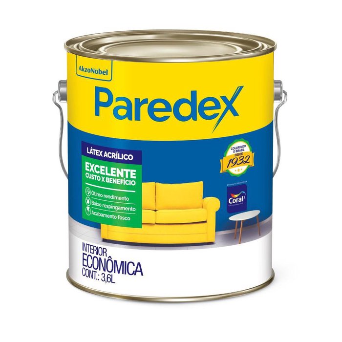 Tinta Acrílica Coral Paredex é um látex acrílico para quem deseja a relação ideal entre qualidade e economia, com bom desempenho em superfícies internas.Características Técnicas da Tinta Acrílica Coral Paredex:- Acabamento: Fosco- Rendimento: Até 50m2- Tempo de Secagem: 30 minutos ao toque / 4 horas entre demãos / 4 horas final.- Demãos: 2 a 3 demãos- Diluição: Pode ser diluído em até 20% com água potável------------------------------------------------------------------------------------------------------------------Dicas para o uso correto da Tinta Acrílica Coral Paredex:- Aplicação: utilize rolo de espuma e pincel de cerdas macias- Recomendações: durante a preparação, aplicação e secagem do produto, mantenha o ambiente ventilado. É recomendado usar luvas e óculos de segurança na hora da pintura.- Limpeza: limpe as ferramentas com água e sabão- Armazenamento: conserve a embalagem bem fechada, sempre na posição vertical, em local coberto, longe de fontes de calor e umidade Tinta Acrílica Coral Paredex 3,6L Indicado para Interiores