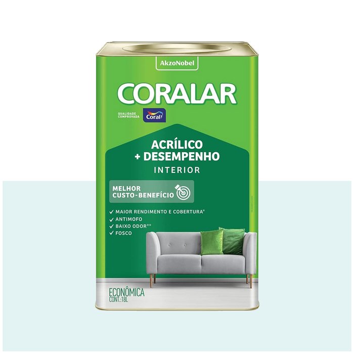 Coralar Acrílico + Desempenho é a tinta econômica que proporciona o melhor custo-benefício, pois possui maior rendimento e cobertura, além de ser antimofo e possuir baixo odor. Rende até 90 m² acabados por embalagem de 18L.