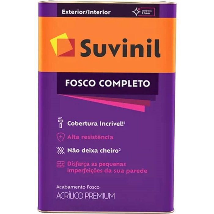 É a tinta completona da Suvinil. Seu alto poder de cobertura permite que você renove a casa de um jeito rápido e prático com menos demãos. E mais, sem sujeira após a aplicação graças a tecnologia antirrespingo. Ela também é lavável, sem cheiro em até 4 horas após a aplicação, com longa durabilidade e seu acabamento fosco não revela imperfeições.