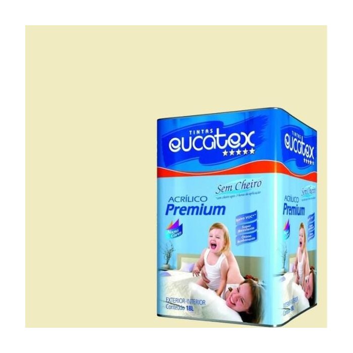 Descrição Eucatex Acrílico Premium Sem Cheiro é uma tinta de alta performance para quem busca melhor desempenho e maior durabilidade e rendimento em pinturas de áreas externas e internas. De fácil aplicação, oferece ótima cobertura, baixo respingamento, é resistente às intempéries, tem excelente alastramento e ótimo acabamento. É indicada para superfícies externas e internas de reboco, massa acrílica, texturas, concreto, fibrocimento, repinturas sobre PVA e acrílico e superfícies internas de massa corrida e gesso.