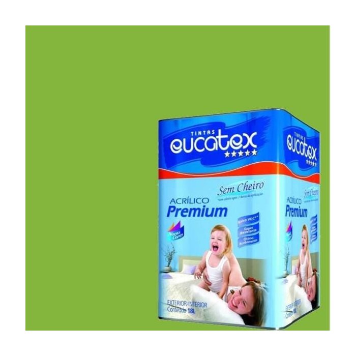 Descrição Eucatex Acrílico Premium Sem Cheiro é uma tinta de alta performance para quem busca melhor desempenho e maior durabilidade e rendimento em pinturas de áreas externas e internas. De fácil aplicação, oferece ótima cobertura, baixo respingamento, é resistente às intempéries, tem excelente alastramento e ótimo acabamento. É indicada para superfícies externas e internas de reboco, massa acrílica, texturas, concreto, fibrocimento, repinturas sobre PVA e acrílico e superfícies internas de massa corrida e gesso.