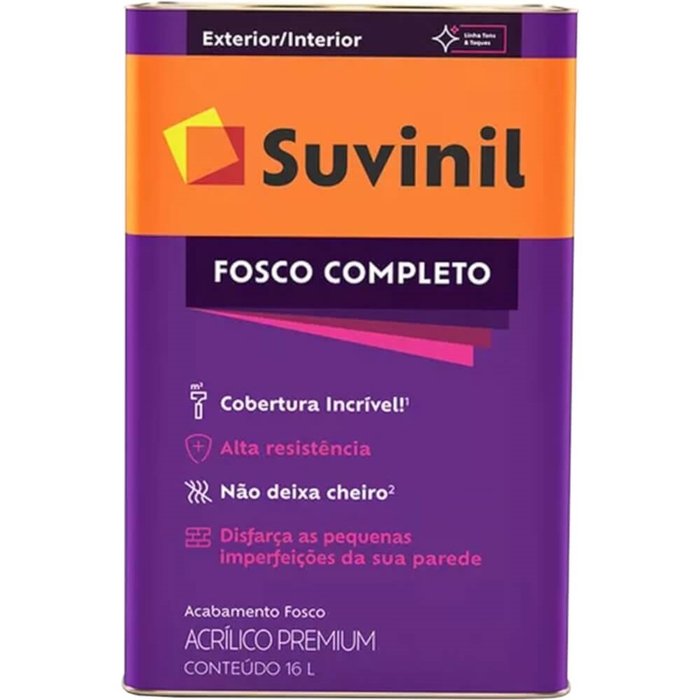 É a tinta completona da Suvinil. Seu alto poder de cobertura permite que você renove a casa de um jeito rápido e prático com menos demãos. E mais, sem sujeira após a aplicação graças a tecnologia antirrespingo. Ela também é lavável, sem cheiro em até 4 horas após a aplicação, com longa durabilidade e seu acabamento fosco não revela imperfeições.