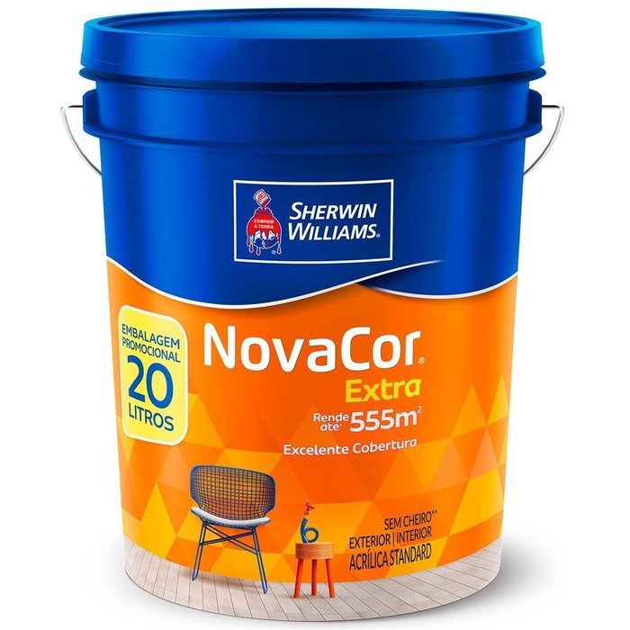 A Sherwin Williams está presente no Brasil há mais de 60 anos com o objetivo de trazer ao mercado as melhores opções em revestimento e proteção, com tintas para as mais diversas finalidades. A empresa atua tanto no segmento imobiliário, quanto industrial, sempre com produtos reconhecidos por sua durabilidade, qualidade e inovação. Entre suas principais marcas estão Metalatex, Novacor, KemTone, Aquacryl e Colorgin, amplamente reconhecidas por formadores de opinião e consumidores. Antimofo: Não | Quantidade Demão: 2 a 3 Demãos | Ferramenta Indicada para Aplicação: Pincel, Pistola e Rolo | Rendimento: Até 555m² a demão | Área Indicada: Exterior e Interior | Informações Adicionais: Informações e dados são de responsabilidade do fornecedor. | Modo de Diluição: Rolo e Pincel: 50% Água Potável para acabamento fosco;30% para acabamento acetinado e semibrilho; Pistola: 35% Água Potável | Marca: Novacor | Linha: Novacor Extra | Tonalidade: Branco | Lavável: Sim | Uso Indicado: Exterior e Interior | Acabamento: Fosco | Cor: Branco | Categoria: Standard | Tempo Aproximado de Secagem: Ao toque: 30 Minutos; Entre demãos: 2 a 4 horas; Final: 4 horas | Nível de Odor: Sem Cheiro | Conteúdo da Embalagem: 1 Lata de 20 Litros