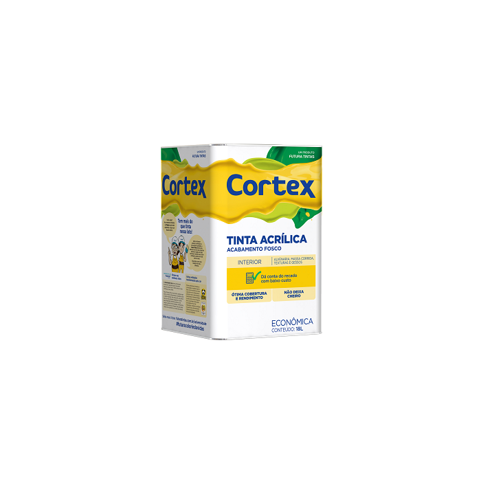 A TINTA ACRÍLICA FOSCA CORTEX é uma tinta para interiores com excelente cobertura, rendimento, economia e mínimo odor. Indicado para pintura de superfícies internas de alvenaria, massa corrida ou acrílica, texturas e gesso.
