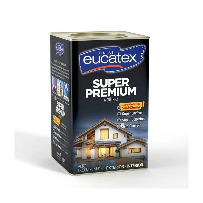 Tinta Acrílica Super PremiumTinta acrílica homologada na nova categoria Super Premium. Produto de excepcional desempenho em resistência, cobertura e lavabilidade. Ainda contem três vezes mais aditivos que evitam o aparecimento de mofo, algas e fungos. Uso exterior e interior.Sua casa mais bonita e colorida por muito mais tempo.*Sem cheiro após 3 horas de aplicação.Acabamento: fosco.Superfície: • AlvenariaDiluição: Com água:• Rolo de lã, trincha e pincel: 30% em todas as demãos• Pistola: 30% de águaRendimento: • Lata 18L: até 150m² por embalagem / pintura acabadaDemãos:• 2 a 3, com intervalo de 4 horas entre as demãos Secagem:• Ao toque: 1 hora• Entre demãos: 4 horas• Final: 12 horasAplicação: • Rolo de lã de pelo baixo• Pincel ou trincha• AirlessDicas e Preparação da Superfície:De acordo com a norma ABNT NBR 13.245.A superfície deve estar firme, coesa, limpa, seca, isenta de poeira, materiais gordurosos e mofo.COM PARTES SOLTAS OU CAIADAS:Devem ser raspadas ou escovadas até completa remoção e em seguida aplicar Eucatex Fundo Preparador de Paredes Premium.MOFADAS:Retirar mecanicamente o mofo e aplicar o Eucatex Zero Mofo conforme indicações e aguardar a secagem.COM MANCHAS DE GORDURA:Lavar com a solução de água e detergente neutro, enxaguar e aguardar a secagem.REBOCO NOVO:Deve-se aguardar a cura por, no mínimo, 30 dias. Aplicar Eucatex Selador Acrílico Premium, se necessário, nivelar a superfície aplicando Eucatex Massa Acrílica (áreas externas) ou Eucatex Massa Corrida (áreas internas).REBOCO FRACO (baixa coesão):Aplicar Eucatex Fundo Preparador de Paredes Premium conforme recomendação da embalagem e, se necessário, nivelar a superfície, aplicando Eucatex Massa Acrílica (áreas externas) ou Eucatex Massa Corrida (áreas internas).TRINCAS:Aplicar o Eucatex Veda Trinca conforme recomendação de embalagem.OBSERVAÇÕES1. Os produtos Semibrilho e Acetinado podem revelar defeitos e imperfeições da superfície de forma mais acentuada que outros acabamentos.2. Para obter um fino acabamento sobre Massa Corrida ou Acrílica, recomendamos utilizar rolo de lã de pelo baixo.3. Em pinturas ou repinturas com retoques ou aplicação de Massas (Corridas, Acrílicas ou Gesso), podem ser notadas diferenças de brilho após a aplicação. Isso se deve à falta de uniformidade na absorção do substrato. Para evitar o efeito, recomendamos a aplicação da própria tinta diluída com 40% de água somente nos pontos que tiveram as correções de massa.4. O rendimento prático do produto pode variar em função do método de aplicação, geometria da estrutura, rugosidade e absorção da superfície, espessura da camada de produto depositada, condições atmosféricas e técnica de aplicação.5. Evite retoques isolados após a secagem da tinta.6. Não indicamos a utilização combinada, ou em mistura, com outros produtos não especificados nesta embalagem.7. Remoção de sujeiras: no local afetado, utilizar pano ou esponja macia com detergente neutro. Em seguida, limpar com pano umedecido. Efetue a limpeza com movimentos suaves, apenas no local afetado para preservar o acabamento original. No caso de sujidades mais profundas, esse processo poderá ocasionar polimento do lme da tinta (diferença de brilho). Cores intensas no acabamento fosco podem esbranquiçar com o atrito.8. A lavabilidade do produto é maior nos acabamentos Semibrilho e Acetinado.9. Algumas cores intensas (vermelho, amarelo, azul e magenta) poderão ter perda gradativa da tonalidade, quando expostas ao intemperismo. Este desbotamento não compromete a proteção e durabilidade da tinta.10. Até 30 dias após a pintura, pingos de chuva isolados podem provocar manchas. Se isso ocorrer, lave imediatamente toda a superfície com água corrente limpa e sem esfregar.11. Evite a aplicação do produto em dias chuvosos, temperatura abaixo de 10ºC ou acima de 40ºC e umidade relativa do ar superior a 90%.