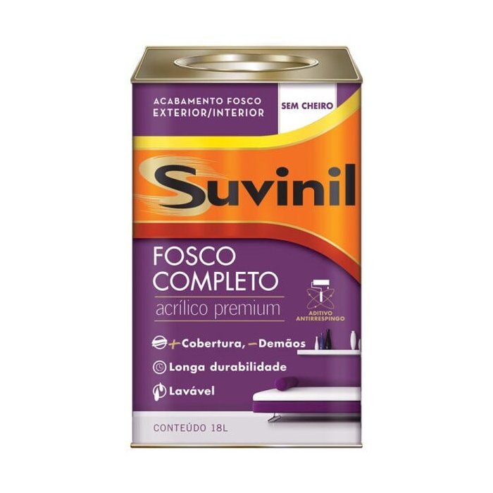 É a tinta completona da Suvinil. Seu alto poder de cobertura permite que você renove a casa de um jeito rápido e prático com menos demãos. E mais, sem sujeira após a aplicação graças a tecnologia antirrespingo. Ela também é lavável, sem cheiro em até 4 horas após a aplicação, com longa durabilidade e seu acabamento fosco não revela imperfeições. Indicado para pintura de superfícies externas e internas de reboco, massa acrílica, texturas, concreto, fibro-cimento e internas de massa corrida e gesso devidamente preparadas.