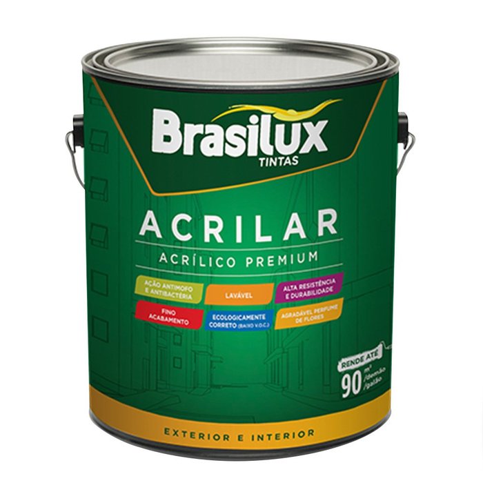 Tinta Acrílica à base de água, com baixa incidência de respingos, boa cobertura e lavabilidade, secagem rápida, fácil aplicação, excelente retenção de cor quando exposta ao tempo e resistência às intempéries e ao mofo.
