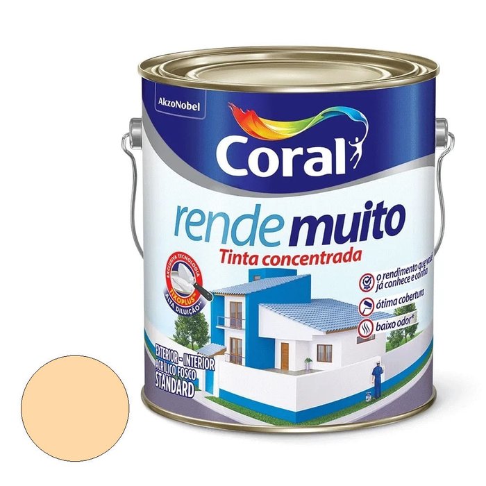 Coral Rende Muito é uma tinta de alta consistência que permite uma diluição superior aos produtos convencionais. Paredes internas e externas, aderindo a diferentes superfícies de alvenaria. Resina acrílica modificada, pigmentos ativos e inertes, surfactantes, coalescentes, espessantes, microbicidas não metálicos, outros aditivos e água. Amarelo Vanilla. Fosco. Miníma 50% e máxima 80% com água potável. Ao toque: 30 minutos - Entre demãos: 4 horas - Final: 4 horas. Até 100 m²/galão/demão.