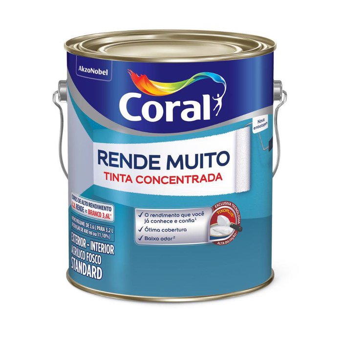 A Tinta Coral é uma tinta de alta consistência que permite uma diluição superior aos produtos convencionais. Você consegue até 80% de diluição sem perder a qualidade que só a Coral oferece.Características Técnicas da Tinta Coral Rende Muito:- Acabamento: Fosco- Rendimento: 30m2 por embalagem- Tempo de Secagem: Ao toque: 30min; Entre demãos: 4h e Final: 4h- Demãos: 2-3 demãos- Diluição: de 50% até 80% de diluição com água potável-----------------------------------------------------------------------------------------------------------------Dicas para o uso correto da Tinta Coral Rende Muito:- Aplicação: utilize rolo de lã de pelo baixo e pincel de cerdas macias- Recomendações: durante a preparação, aplicação e secagem do produto, mantenha o ambiente ventilado. É recomendado usar luvas e óculos de segurança na hora da pintura.- Limpeza: limpe as ferramentas com água e sabão- Armazenamento: conserve a embalagem bem fechada, sempre na posição vertical, em local coberto, longe de fontes de calor e umidade.Tinta Coral Rende Muito 3,2L