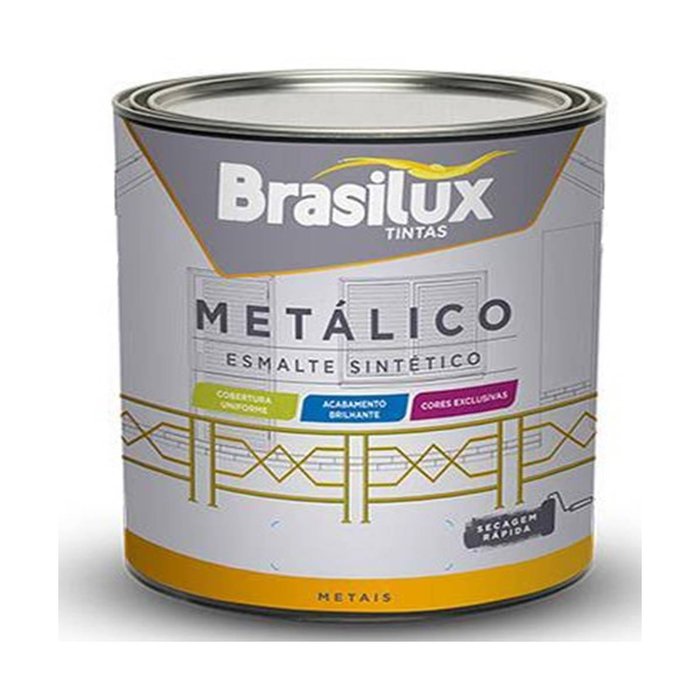 Marca Brasilux Linha METALICO Modelo Galão Tipo de tinta Esmalte Volume da unidade 3.6 L Unidade de venda galão Outras características Rendimento: 35 m² Superfícies aptas: Madeira,Metais Ambientes: Exterior Tempo de secagem: 24 h Tipo de base: Óleo Descrição APLICAÇÃO Recomendado para acabamentos em ambientes internos e externos, sobre superfícies de madeiras e metais ferrosos de fins imobiliários, proporcionando excelente alastramento e brilho. DESCRIÇÃO Esmalte Sintético Metálico de excelente aderência e brilho, de fácil aplicação, rápida secagem e resistências às intempéries.