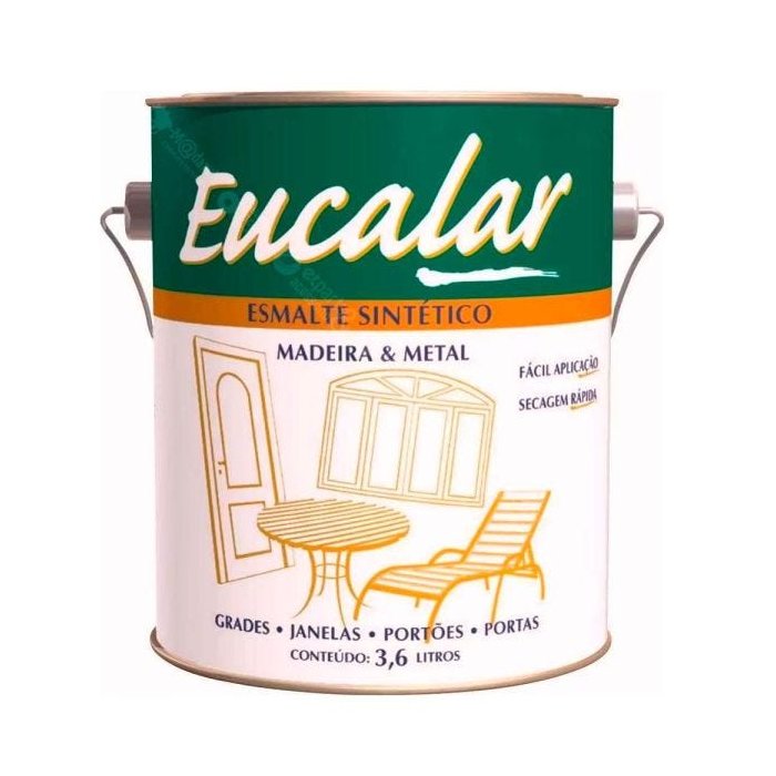 Tinta Esmalte Sintético Eucalar 3,6 Litros - Eucatex Excelente acabamento e fácil aplicação para superfícies de metal, madeira e alvenaria. Eucalar Esmalte Sintético é indicado para a pintura de superfícies externas e internas de metais, madeiras e alvenaria. É um produto de alta qualidade, de fácil aplicação, secagem rápida, excelente rendimento e durabilidade, proporcionando ótimo acabamento e grande resistência às intempéries. Eucalar Esmalte Sintético é um produto de custo econômico e boa qualidade, indicado para aplicação em superfícies externas e internas de madeiras e metais, disponível nos acabamentos brilhante e acetinado. É de fácil aplicação, e oferece boa resistência às intempéries e bom alastramento. De acordo com a norma ABNT NBR 13.245. Para obter fino acabamento e garantir uma perfeita aderência, é fundamental fazer o lixamento antes de iniciar a pintura e entre as demãos. Também é importante observar o intervalo entre demãos para obter o melhor resultado possível; Ao diluir a tinta, utilize sempre Eucatex Aguarrás para manter as características do produto. Nunca utilize tíner, gasolina, benzina ou outros solventes; Antes de iniciar a pintura, é importante homogeneizar adequadamente o produto com o auxílio de uma ferramenta retangular apropriada; Após utilizar qualquer removedor de tinta, verifique se a superfície está sem resíduos do removedor utilizado, antes da aplicação do Eucalar Esmalte Sintético. Essa remoção deve ser feita com pano embebido em Eucatex Thinner. Informações Técnicas: Acabamento: Brilhante Composição: Superfície: Madeiras / Metais Diluição: Com aguarrás Primeira demão: 15% - (40 a 50m²/ demão) Demais: 10% - (40 a 50m²/ demão) Secagem: Ao toque: 4 a 5 horas Final: 24 horas Demãos: Duas a três com intervalo de 12 horas Aplicação: Rolo Pincel Trincha Pistola Código: 17.1.001 - Branco 17.1.33119 - Marfim 17.1.005 - Preto 17.1.33124 - Tabaco Obs. Produto vendido por unidade. Imagem meramente ilustrativa. Atenção: Não nos responsabilizamos pela má utilização do produto.