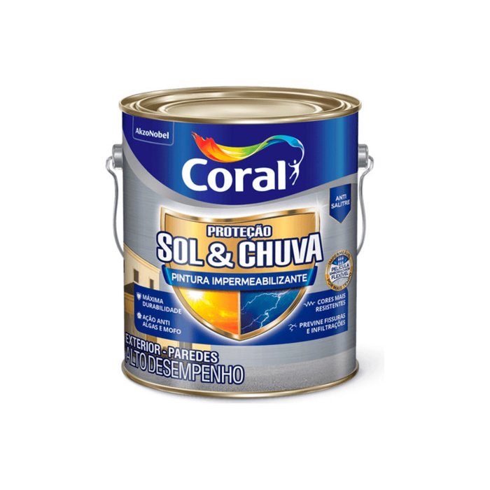 Acabamento: Eggshell; - Linha: Proteção Sol e Chuva; - Para Áreas Internas e Externas em Alvenaria; - Baixa Emissão de CO; - Rendimento Acabado: de até 15 m por embalagem (3,2 L) (aproximadamente, depende da rugosidade da parede); - Ótima Durabilidade; - Lavável; - Conteúdo: 3,2 Litros. Dados de Aplicação - Homogenize a tinta antes de pintar; - Diluente: Água; - Diluição: Em superfícies não pintadas, adicione 30% de água potável à 1 parte de tinta e para outras demãos ou outras superfícies já pintadas, adicione 20% de água potável à 1 parte de tinta. - Normalmente, com 2 ou 3 demãos, você já consegue um excelente resultado. Mas de dependendo do tipo e estado da parede e da cor, pode ser que você precise de mais demãos; - Acessórios de Pintura: Rolo de lã de pelo baixo ou pincel de cerdas macias; - Secagem ao Toque: 30 min; - Secagem Entre Demãos: 4 horas; - Secagem Final: 4 horas; - Limpeza: Limpe as ferramentas com água e sabão. Observações: - A cor da tinta pode ter uma leve diferença de tonalidade em comparação à foto. Praticamente imperceptível. - Se sua parede está com algum problema como umidade, descascamento, fissuras, manchas, bolor, mofo, etc. Contrate um profissional para resolver o problema antes da pintura. Recomendações: - Evite a aplicação em dias chuvosos, temperatura abaixo de 10 C ou acima de 40 C e umidade relativa do ar superior a 85%. Armazenagem: - Conserve a embalagem bem fechada, sempre na posição vertical, em local coberto, longe de fontes de calor e umidade. Para mais informações, consultar o rótulo e a Ficha de Segurança do Produto (FISPQ). Mantendo o Visual: - Limpe a superfície utilizando pano ou esponja macia umedecida com água e detergente neutro sem esfregar. Saúde e Segurança: - Durante a preparação, aplicação e secagem do produto, mantenha o ambiente ventilado. É recomendado usar luvas e óculos de segurança na hora de pintar. Para mais informações, consultar o rótulo e a Ficha de Segurança do Produto (FISPQ). Reciclagem: - Não jogar o produto em drenos, esgotos e vias pluviais, resíduos que não serão mais utilizados devem ser descartados conforme legislação local vigente. Importante: - O valor é referente a unidade. (Lata de 3,2L). - Garantia de 3 meses contra defeitos de fabricação