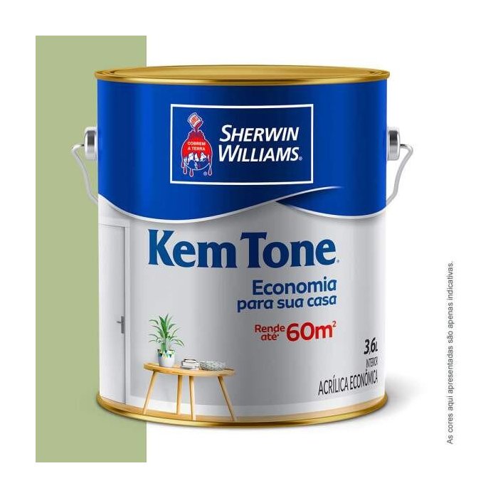 Título:VERDE KIWICaracterísticas:Kem Tone é uma tinta acrílica de fácil aplicação que garante maior cobertura para sua casa, com um acabamento fosco perfeito e excelente rendimento. Suas cores realçam, embelezam e protegem superfícies internas. Rendimento: Galão (3,6L): 40m² a 60m² por demão. Cores: Conforme cartela de cores no acabamento fosco. Para adquirir uma tonalidade extra, além das cores disponíveis em cartela, misture as cores do Kem Tone Tinta Acrílica entre si, ou até o máximo de 1 bisnaga de 50ml de CORANTE LÍQUIDO XADREZ® ou GLOBO COR para cada galão de 3,6 litros. XADREZ® marca registrada da Lanxess Deutschland GmbH, Germany. Secagem: Ao toque: 30 minutos Entre demãos: 2 a 4 horas Final: 4 horas Aplicação: - Misture bem o produto antes e durante a aplicação; - Aplique com temperatura ambiente entre 10°C e 40°C; - Evite aplicar em dias chuvosos, sobre superfície quente, com corrente de ar intensa ou com umidade relativa do ar superior a 90%; - Aplique o produto por igual, evitando repasses excessivos; - Não interrompa a aplicação no meio da superfície; - Evite retoques isolados após a secagem do produto.Descrição:TINTA KEMTONE VERDE KIWI GL-SHERWI