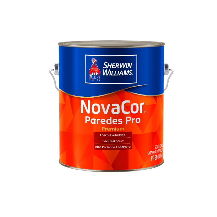 Tinta Premium NovaCor Paredes PRO Fosco - SHERWIN-WILLIAMS é uma tinta acrílica premium de acabamento fosco aveludado, indicada para superfícies externas e internas com alto poder de cobertura. Possui fórmula exclusiva que suaviza imperfeições garantindo facilidade no retoque*. Novacor Paredes Pro possui excelente cobertura, durabilidade, rápida secagem, ótimo rendimento, tecnologia e inovação que só uma marca forte no mercado pode proporcionar. Secagem: Ao toque 30 minutos Entre demãos 2 a 4 horas Final 4 horas. Aplicação: - Aplique o produto por igual, evitando repasses excessivos. - Não interrompa a aplicação no meio da superfície. - Evite retoques isolados após a secagem do produto. - Misture bem o produto antes e durante a aplicação. - Aplique com temperatura ambiente entre 10 °C e 40 °C. Evite aplicar em dias chuvosos, com corrente de ar intensa, com umidade relativa do ar superior a 90 % ou quando a superfície estiver muito quente