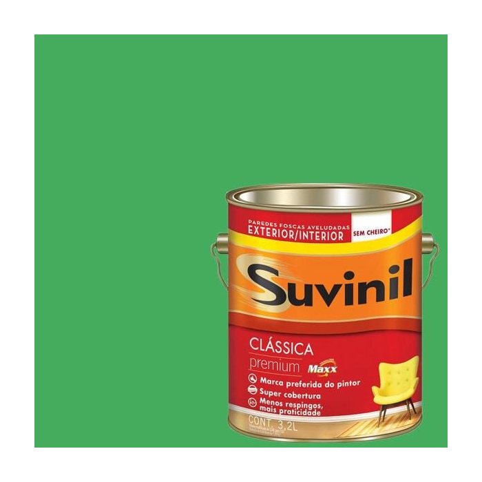 Descrição: Tinta Látex Maxx Premium Suvinil. Tinta látex com acabamento fosco aveludado. Indicada para utilização tanto em ambientes internos como externos, apresentando alta resistência, rendimento e cobertura.