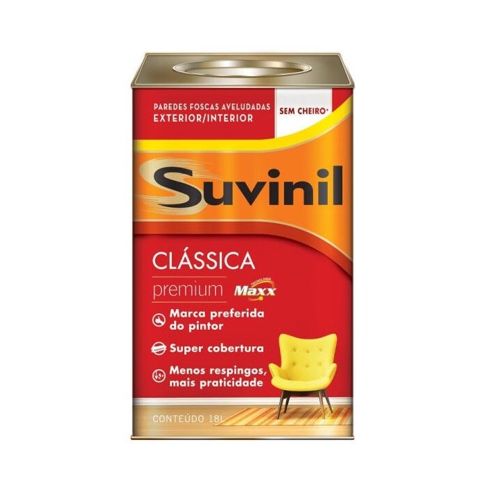 A Suvinil Clássica Maxx é uma Tinta Látex Premium com fórmula base água e acabamento fosco de alto desempenho. Indicada para uso externos e internos, apresenta alta resistência e rendimento além de possuir ultra cobertura, onde a pintura é concluída em menos tempo. A sua fórmula proporciona menos respingos e mais praticidade. É o produto que reflete a qualidade e tradição da marca Suvinil. Possui rendimento de até 380m² por demão.
