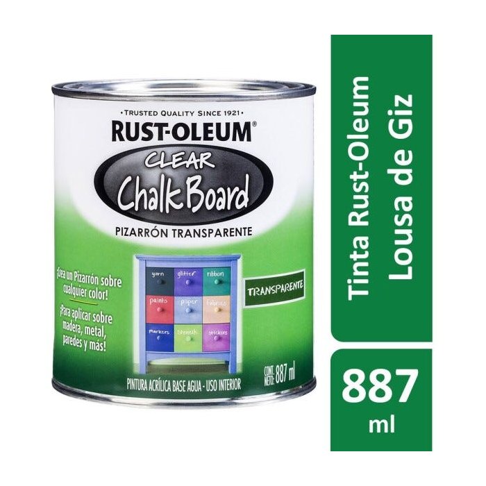 Rust-Oleum® ChalkBoard é uma tinta que permite criar uma lousa sobre praticamente qualquer superfície ou objeto. Sua fórmula ultrarresistente e de alta qualidade permite criar a superfície perfeita para escrever com giz e apagar. Para madeira, melamina, alvenaria, vidro e muito mais! Sua fórmula inovadora à base de água, praticamente sem cheiro, com secagem rápida, oferece a comodidade de poder lavar os itens utilizados com água e sabão. Ideal para projetos de maior tamanho, para pintar em ambientes em que é complicado utilizar um produto em aerossol, ou para aqueles que priorizam os benefícios de se utilizar um produto à base de água. Depois de aplicar, deixe a tinta secar pelo tempo indicado no recipiente (72 horas) Antes de escrever pela primeira vez, prepare a superfície esfregando-a suavemente com o lado de um giz. Em seguida, apague e pronto! Já estará pronta para usar.