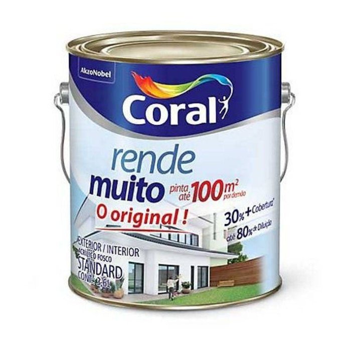 Tinta Acrílica Rende Muito Cromo Suave 3,6 Litros, por ter uma maior consistência, permite uma diluição superior aos produtos convencionais. Com isso, consegue 20% mais rendimento, sem perder cobertura. A fórmula balanceada de Rende Muito apresenta um bom acabamento, tanto em paredes internas como externas, aderindo a diferente superfícies de alvenaria. É uma tinta acrílica de fácil aplicação e baixíssimo respingamento. Acabamento: Fosco Categoria: Standard Rendimento: Até 100m² por demão Conteúdo da Embalagem: 3,6 Litros Composição: Resina acrílica modificada, pigmentos ativos e inertes, surfactantes, coalescentes, espessantes, microbicidas não metálicos, outros aditivos e água Área Indicada: Exterior e interior Quantidade Demão: De 2 a 3 demãos Tempo Aproximado de Secagem: De 30 minutos a 4 horas