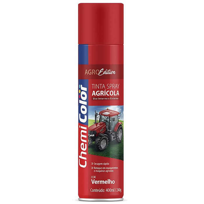 A tinta spray Chemicolor Agrícola foi desenvolvida com os componentes ideais para efetuar reparos em maquinário e equipamentos agrícolas. Pode ser aplicada em diversas superfícies de metal ? lembrando que deve-se seguir o tratamento adequado de pré-aplicação para obter o resultado desejado.