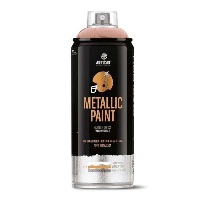 Tinta Spray Metálica Pro Rose Gold Cintilante Mtn 400ml - A cor metálica do seu sonho agora em spray. A ;tinta metálica ;rose gold da Linha MTN oferece alta performance e um tom metalizado ao acabamento do seu projeto de pintura em superfícies de madeira, vidro, metal e plástico. Diferenciais e vantagens da tinta metálica