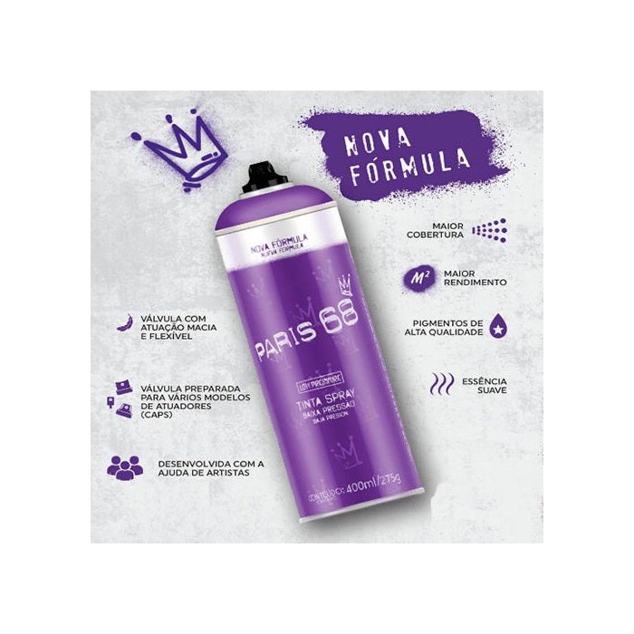 O Spray de tinta em Aerossol Paris 68 da Marca Baston, possui essência suave de morango com champagne. Tinta desenvolvida com pigmento de alta qualidade, dando mais durabilidade e vivacidade na cor. Produto de excelente cobertura. Possui válvula macia, com formato anatômico que permite maior precisão nos traços, além de ser de baixa pressão permitindo o controle durante a aplicação de tinta.