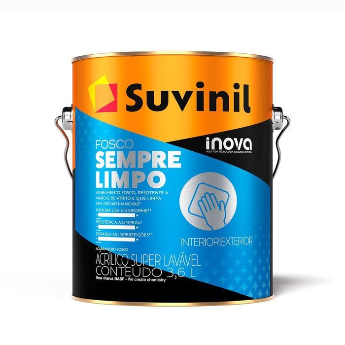 A Tinta Suvinil Inova Fosco Sempre Limpo é a escolha ideal para quem busca um acabamento fosco elegante e fácil de limpar. Com tecnologia inovadora que permite uma limpeza sem manchas, essa tinta oferece máxima performance e praticidade, garantindo uma pintura lisa, uniforme e resistente. Benefícios: Fácil de Limpar: A tecnologia avançada permite a remoção de manchas com facilidade, mantendo as superfícies sempre impecáveis. Acabamento Fosco: Proporciona um toque suave e elegante, disfarçando imperfeições das paredes. Durabilidade e Resistência: Alta resistência à limpeza, preservando a qualidade e beleza da pintura por mais tempo. Versatilidade: Ideal para ambientes internos, podendo ser aplicada em diversas superfícies como massa acrílica, massa corrida, gesso, textura, reboco, fibrocimento e concreto.Características e Diferenciais: Aplicação Fácil: Pode ser aplicada com rolo, pincel ou pulverizador, facilitando o trabalho dos profissionais de pintura. Secagem Rápida: Menor tempo de espera entre as demãos, acelerando o processo de pintura. Ótima Cobertura: 3,6 litros rendem até 50m² por demão, proporcionando um excelente custo-benefício. Baixo Odor: Fórmula de baixo odor, garantindo mais conforto durante a aplicação.Especificações Técnicas: Marca: Suvinil Modelo: Inova Fosco Sempre Limpo Volume: 18 litros Cobertura: Até 50m² por demão Aplicação: Interna Acabamento: FoscoPerguntas Frequentes: Quais superfícies são adequadas para a aplicação da Tinta Suvinil Inova Fosco Sempre Limpo? A tinta é ideal para superfícies internas, como massa acrílica, massa corrida, gesso, textura, reboco, fibrocimento e concreto.Quantas demãos são recomendadas para obter um bom acabamento? Recomenda-se aplicar duas a três demãos para garantir uma cobertura perfeita e uniforme.Qual é o tempo de secagem entre as demãos? O tempo de secagem ao toque é de aproximadamente 30 minutos e a secagem completa entre demãos é de 4 horas.A tinta é realmente fácil de limpar? Sim, graças à tecnologia avançada, a Tinta Suvinil Inova Fosco Sempre Limpo permite a remoção de manchas sem deixar resíduos, mantendo a pintura impecável.