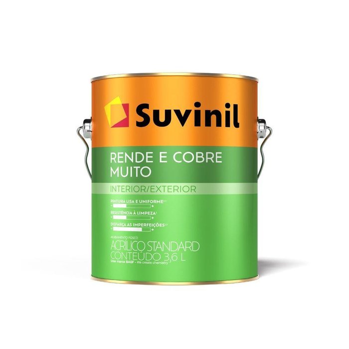 Para calcular a quantidade de tinta, meça a área a ser pintada e use a fórmula: (largura x altura) - área das janelas e portas. Divida o resultado pelo rendimento por litro indicado na embalagem. Tinta Suvinil Rende & Cobre Muito 3,6L - Alta Cobertura A Tinta Suvinil Rende & Cobre Muito é a escolha perfeita para quem busca eficiência e qualidade na pintura. Este produto oferece uma série de benefícios que garantem um acabamento impecável e duradouro. Benefícios: Baixo Odor: Proporciona um ambiente mais agradável durante a aplicação. Ótima Cobertura: Ideal para cobrir superfícies com poucas demãos. Excelente Rendimento: Pinta mais áreas com menos tinta, garantindo economia. Fácil de Espalhar: A aplicação é simples, rápida e uniforme, facilitando o trabalho dos profissionais da pintura. Características e Diferenciais