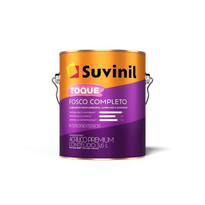 A Tinta Suvinil Toque Fosco Completo 3,6L é a escolha ideal para quem busca um acabamento fosco impecável, superliso e uniforme nas paredes internas da sua casa. Oferece alta performance e um visual sofisticado.Benefícios: Máxima Performance: Proporciona uma pintura lisa e uniforme, garantindo um resultado profissional. Resistência à Limpeza: Mantém a qualidade do acabamento mesmo após diversas limpezas. Disfarce de Imperfeições: Esconde melhor as imperfeições das superfícies, deixando um acabamento perfeito.Características e Diferenciais: Acabamento: Fosco, ideal para um visual elegante e sofisticado. Cobertura: Excelente, com menos demãos para uma cobertura perfeita. Durabilidade: Alta resistência, especialmente em áreas internas. Aplicação: Indicada para profissionais da pintura e donos de imóveis que buscam um acabamento de alta qualidade.Especificações Técnicas: Marca: Suvinil Cor: Disponível em diversas cores Conteúdo: 3,6L Rendimento: Aproximadamente 50m² por demão Secagem: Toque em 30 minutos, entre demãos 4 horas, final 12 horas Diluição: 20% de água potávelPerguntas Frequentes:Esta tinta é lavável?