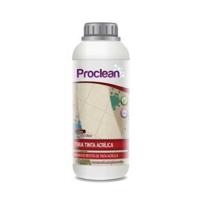 Tira Tinta 1 Litro Proclean Poderoso removedor para restos de tinta acrílica em todos os tipos de superfície sem danificar. Indicação Realizar teste prévio com o produto em um piso solto ou em um canto do piso para avaliar se o resultado é o esperado. De acordo com o grau de impregnação da tinta, observe a indicação de diluição acima. Espalhe o produto sobre o local a ser limpo. Aguarde o tempo de ação de 5 a 10 minutos e esfregue a área a ser limpa com auxílio de uma fibra de limpeza, esponja ou uma escova de limpeza. Caso ainda fique restos de tinta, repita a operação. Em pisos de madeira aplicar o produto umedecendo um pano e esfregar a solução diretamente nos restos ou respingos de tinta. Enxague para ter um melhor resultado. Em pisos de madeira remover o excesso com um pano úmido. Armazenamento MANTENHA FORA DO ALCANCE DE CRIANÇAS E ANIMAIS DOMÉSTICOS. Manter o produto em sua embalagem original. Armazenar em local seco e fresco, longe de fonte de calor e luz direta. Manter o frasco do produto sempre na vertical. Precauções e Segurança Não ingerir. Evite inalação ou aspiração, contato com os olhos e contato com a pele. Em caso de contato com os olhos e a pele, lave imediatamente com água em abundância. Em caso de ingestão, não provoque vômito e consulte imediatamente o Centro de Intoxicações ou o médico levando o rótulo do produto. Lave com bastante água corrente os objetos e utensílios utilizados como medida antes de reutilizá-los. Segurança IMPORTANTE USO DE LUVAS E ÓCULOS. ** Preço do produto em PEÇA **