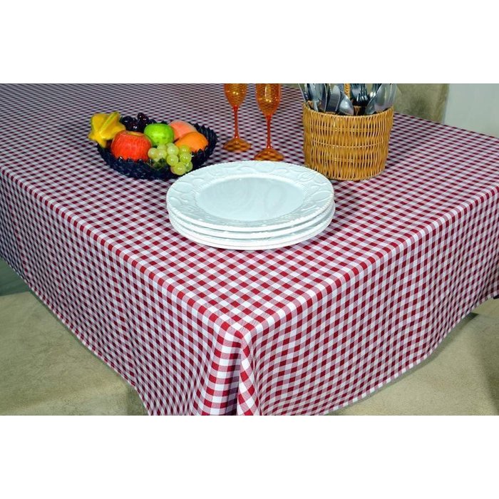 Toalha de mesa em tecido oxford importado, com estampa em xadrez nas cores vermelho e branco, acabamento em bainha em toda lateral.