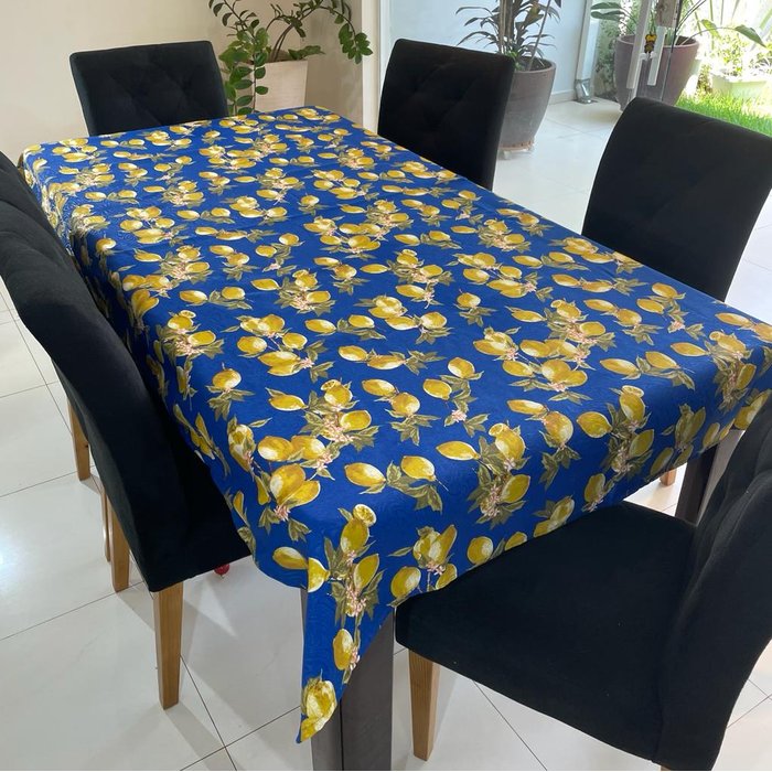 | Modelo | Toalha de Mesa Retangular em Jacquard Limão Siciliano Fundo Azul Royal - 2,20m x 1,40m |