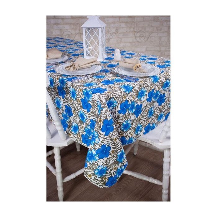 Toalha de Mesa Retangular em Tecido Jacquard Estampado Hibisco Azul Fundo Branco 1,40m X 1,40m