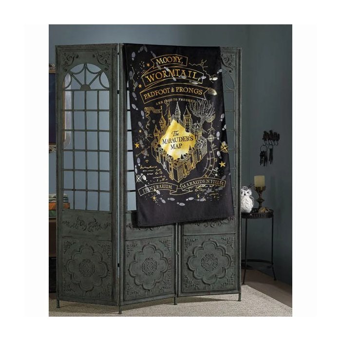 A toalha traz o Mapa do Maroto que é um mapa de Hogwarts com propriedades mágicas criado nos anos 70, pelos quatro marotos: Remo Lupin (Aluado), Pedro Pettigrew (Rabicho), Sirius Black (Almofadinhas) e Tiago Potter (Pontas).