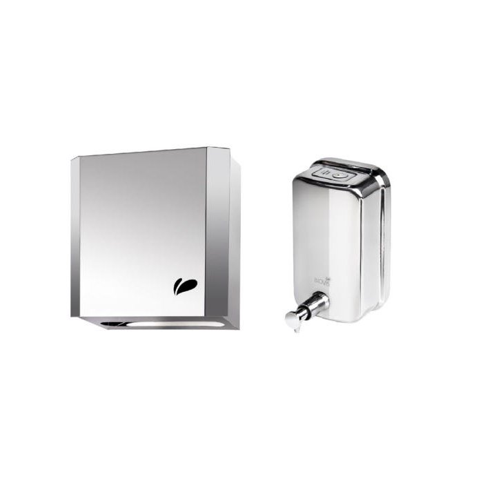 Toalheiro Dispenser Papel + Saboneteira Inox BiovisDispensador Manual de papel Toalha Com visor e chave;Possui um sistema inovador de abertura;Especificações:Capacidade 600 folhasDimensões do produto (Altura x Largura x Comprimento):26 x 25 x 13,5 cmMatérial: Aço InoxPeso Líquido 1,300 kg----Saboneteira de Pressão InoxDispensador para sabonete líquido com reservatório de 500ml e bico dosador. Resistente a diversos produtos anti-sépticos incluindo álcool. Design sofisticado e resistente. Ideal para hospitais, consultórios, cozinhas, empresas, laboratórios, vestiários e banheiros.Capacidade: 500mlDimensões aproximadas (Altura x Largura x Comprimento): 15 x 9,5 x 11 cmMatéria Prima: Aço Inox PolidoPeso Líquido: 0,300 kgAcompanha: Suporte para ser fixado na parede, 3 parafusos, 3 buchas, parafuso interno para travar a saboneteira no suporte.O kit inclui: 1 dispenser saboneteira + 1 Dispenser de papel toalha