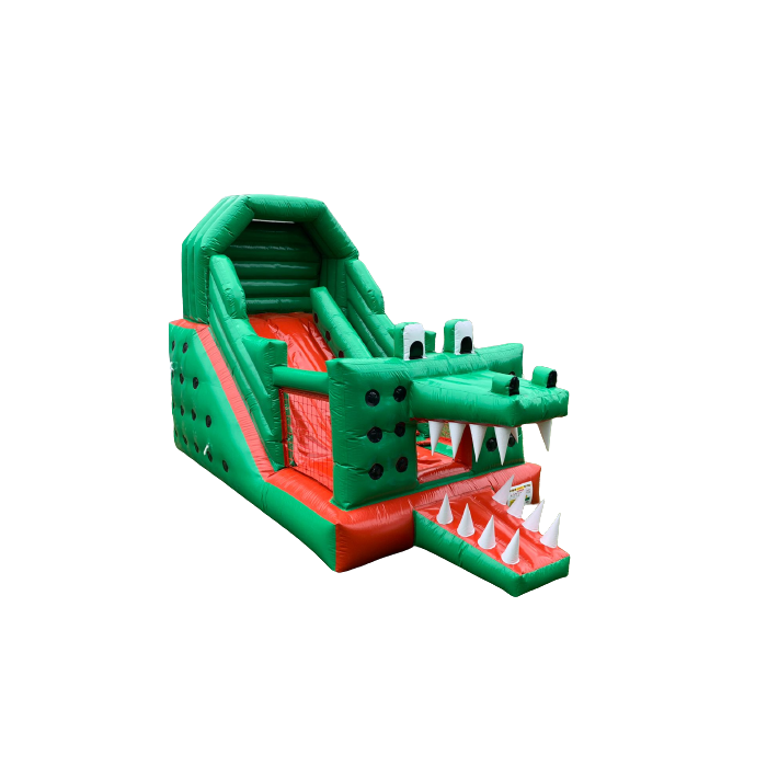 Um charmoso Tobogã Jacaré Inflável fabricado em KP1100 e soldas super reforçadas.