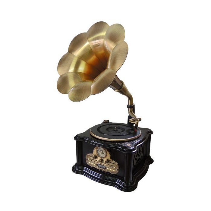 Exclusivo Gramofone com alto falante embutido, reforçando o visual clássico do aparelho.