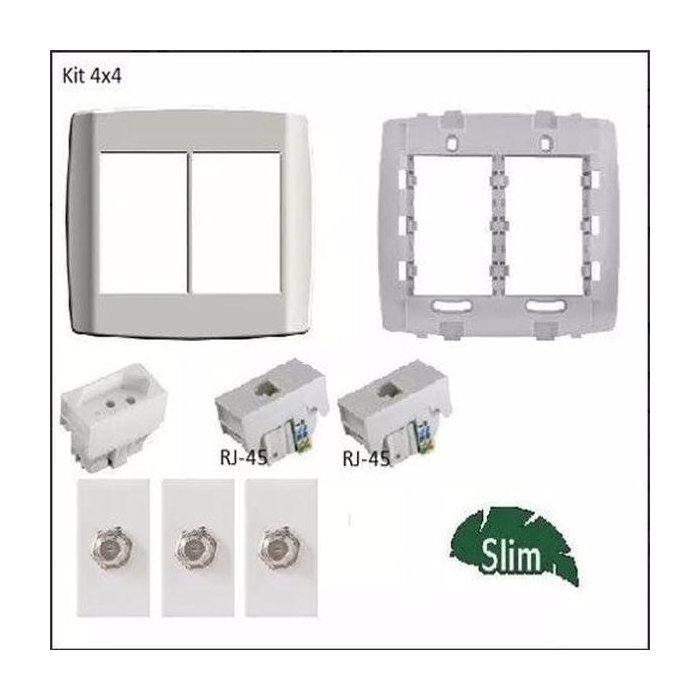 Tomada 4x4 Com 1 Tomadas 10a + 2 Rj45 Slim + 3 coaxiais Kit Tomada 4x4 Slim Ilumi Configuração: 1 Módulos Tomadas 10a 2 Módulo Tomada Rj45 3 Módulos para Antena Coaxiais 1 Placa Acabamento 4x4 para 6 Módulos 1 Suporte 4x4 para 6 Módulos