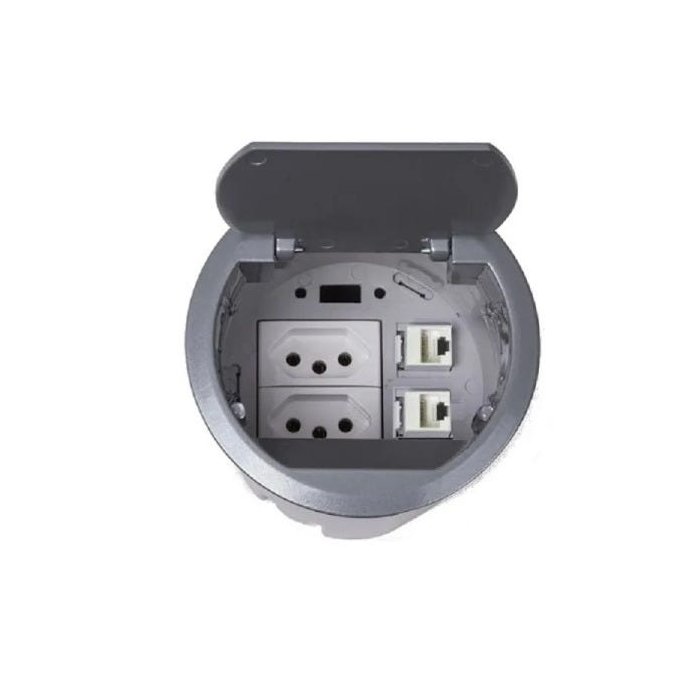 Tomada Para Mesa Multy 4 Redonda Em Alumínio Com 2 Tomadas, 2 RJ45, fabricada em alumínio ( colarinho e tampa ) e ABS de engenharia PVC ( fundos ). Possibilita a colocação de módulos diferentes de acordo a necessidade.