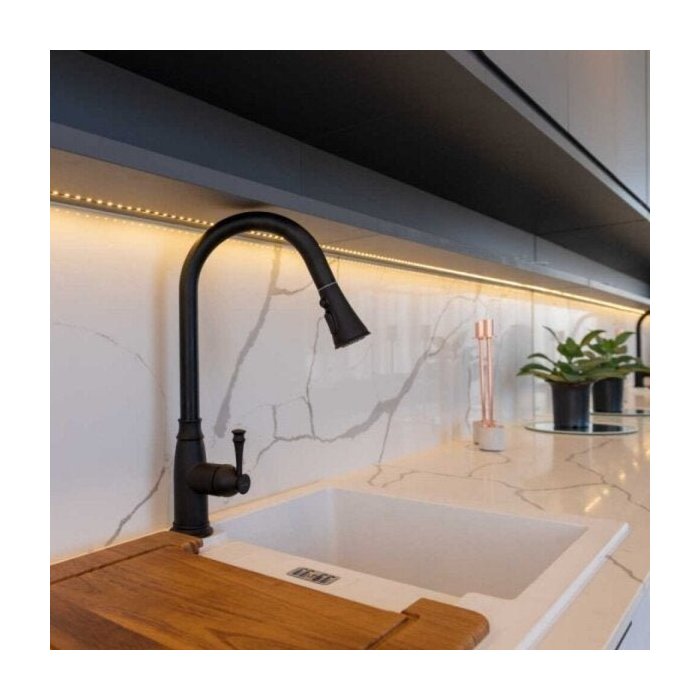 A Torneira Monocomando Gourmet de Cozinha Creta Preta, com acabamento fosco, é uma torneira gourmet de design retrô, projetada para uso em cozinhas domésticas ou industriais. Essa torneira possui extensor flexível com duas opções de spray e haste móvel com giro de 360°, permitindo assim a lavagem de alimentos e utensílios de forma mais prática e controlada. A torneira contém um misturador monocomando, o qual pode ser conectado à água quente e fria para controle de vazão e temperatura através de um único acionamento. Alternativamente, é possível adaptá-la também para uso apenas com água fria.