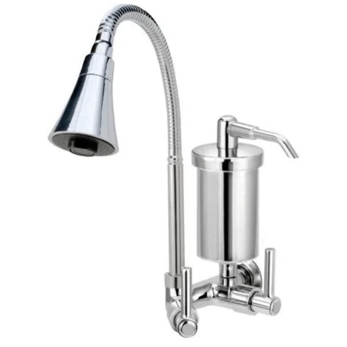 Base em metal de altíssima qualidade modelo designado para instalação em paredes de cozinhas; fechamento 1/4 de volta - sistema de abertura da torneira segura e econômica; produto anticorrosivo e anti-ferrugem; acompanha filtro resistente em abs, com refil interno substituível (vela de carvão ativado); tubo gourmet, com duas intensidades de jato de água reguladas na própria cabeça da torneira, flexível, de bica móvel, facilitando a movimentação da mesma para direcionar onde quer que o fluxo seja direcionado. Del metais.