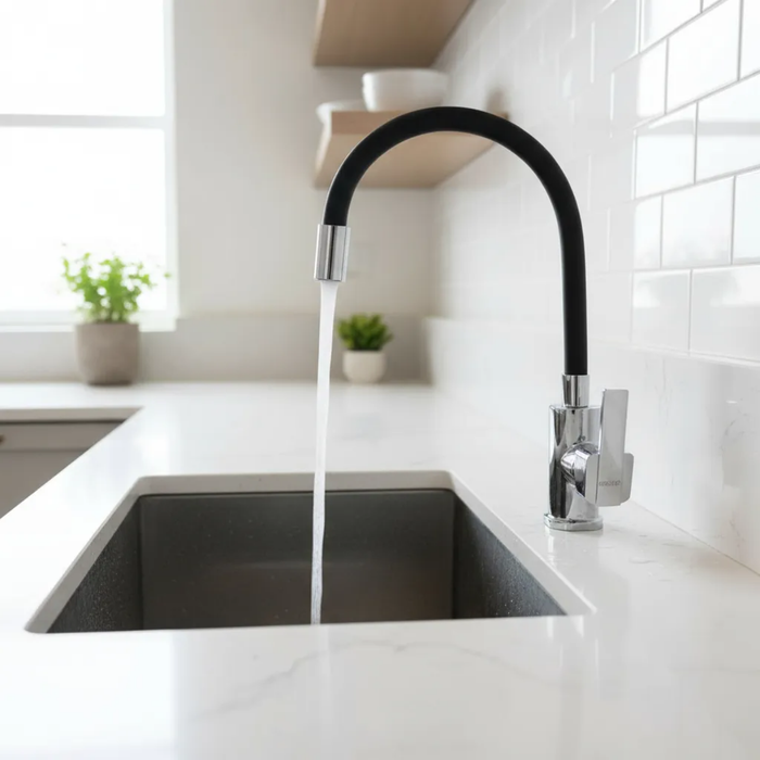Funcionalidade e elegância se encontram nesta Torneira Flexível para Cozinha. Com corpo emborrachado preto e detalhes cromados, ela traz um toque sofisticado e contemporâneo ao ambiente, sem abrir mão da praticidade.